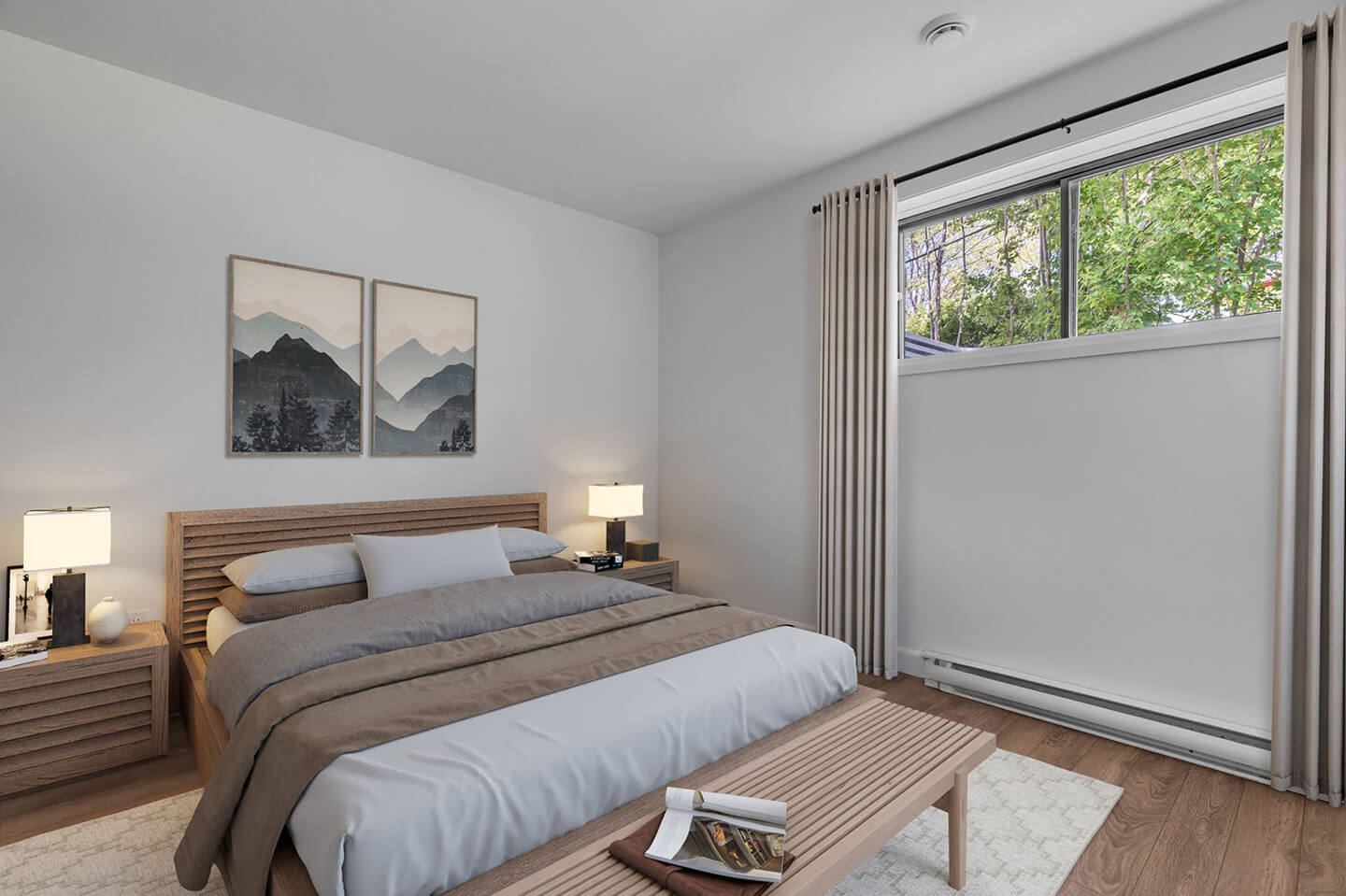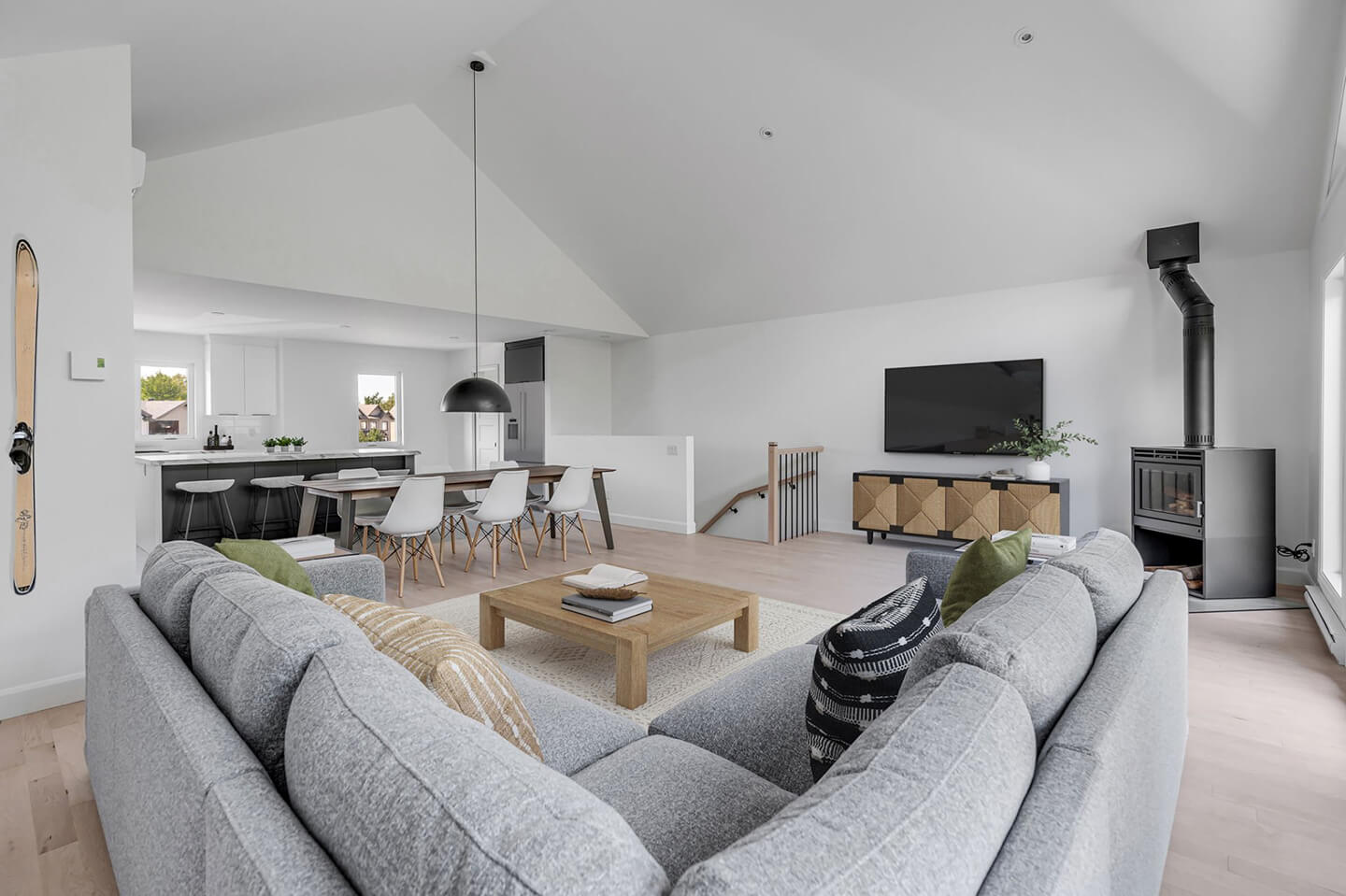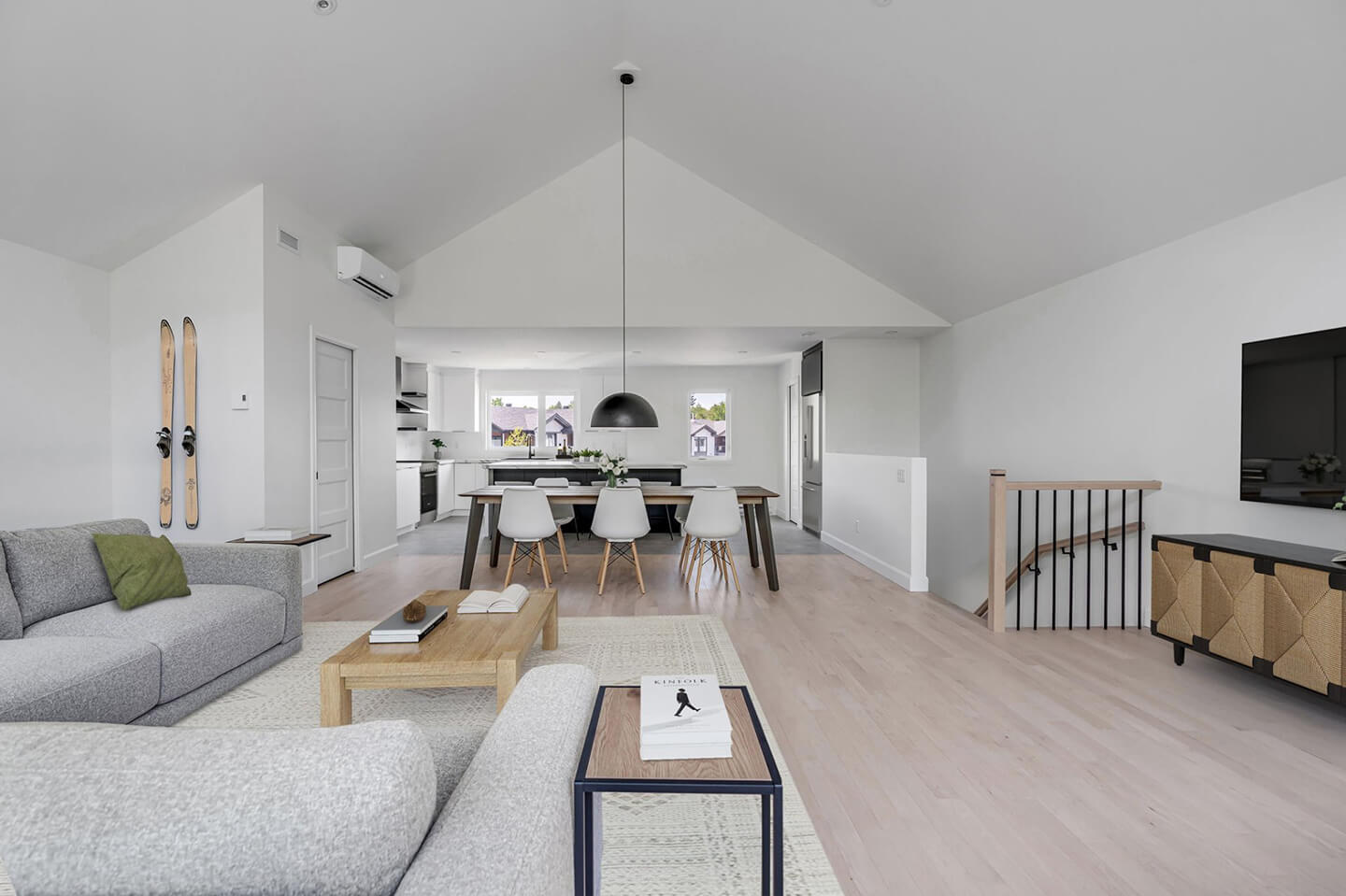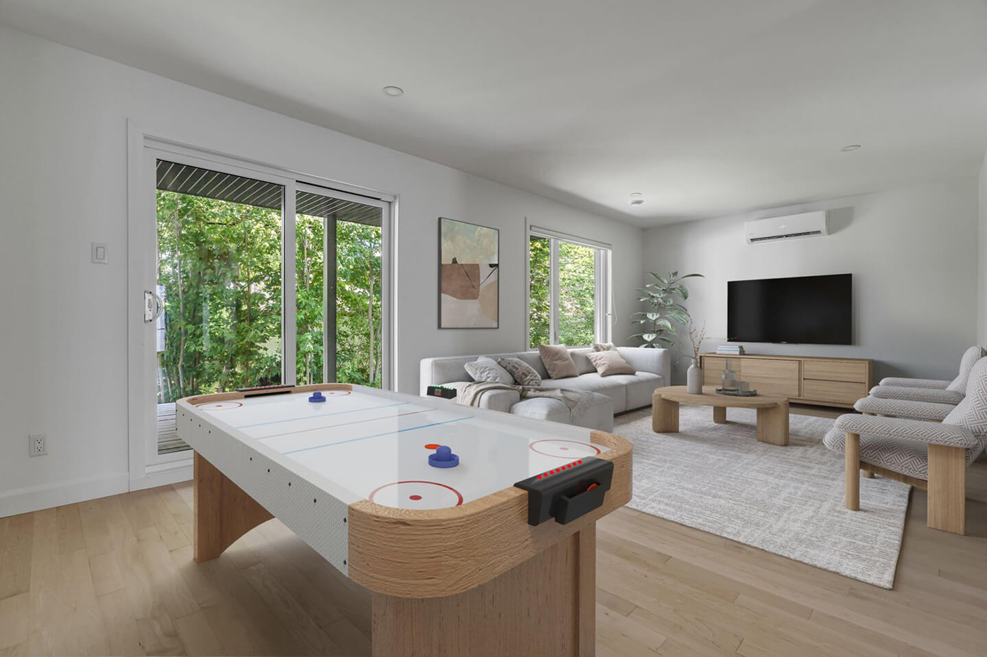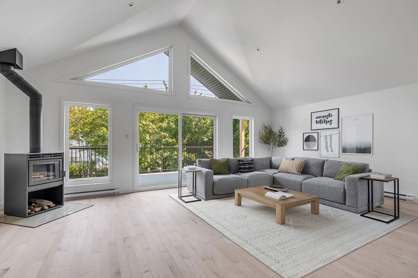 Cette maison en rangée sur 3 étages se démarque par son impressionnant toit cathédrale qui traverse entièrement la structure et apporte une sensation de hauteur spectaculaire. Le plan vertical maximise chaque niveau : espaces de vie lumineux, cuisine d’exception, foyer au bois chaleureux, chambres bien réparties et rangements intégrés partout — incluant une remise avant parfaite pour l’équipement sportif.